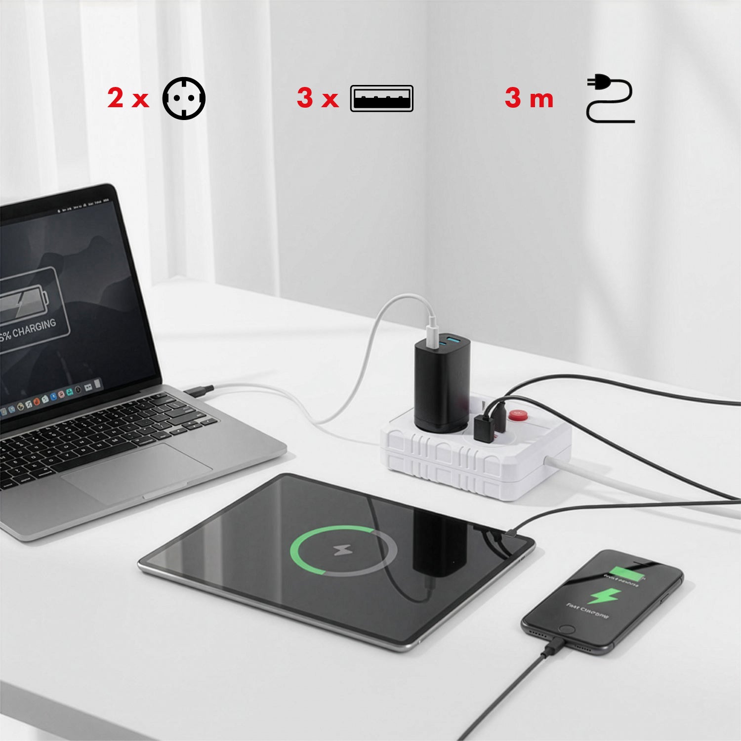 2 prize de rețea și 3 porturi USB - energie mereu la îndemână