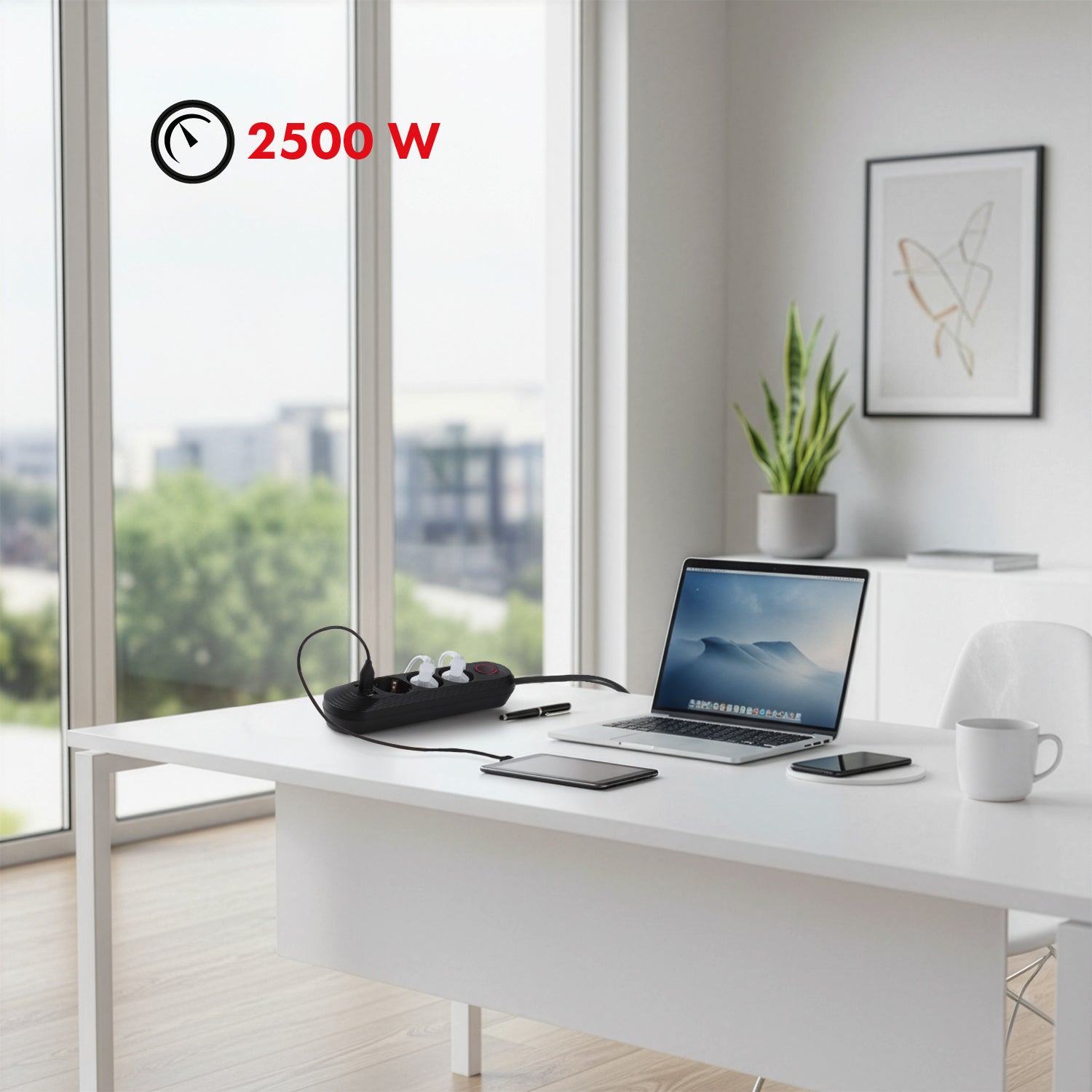 Regula de alimentare vă permite să conectați echipamente cu o putere totală de până la 2500W, ceea ce înseamnă că va alimenta cu ușurință un computer, monitor, imprimantă, televizor, încărcătoare sau lămpi de birou. Componentele de înaltă calitate și o dispunere bine gândită a prizelor protejează echipamentul de suprasarcină și asigură o funcționare stabilă chiar și în condiții de încărcare pe termen lung.