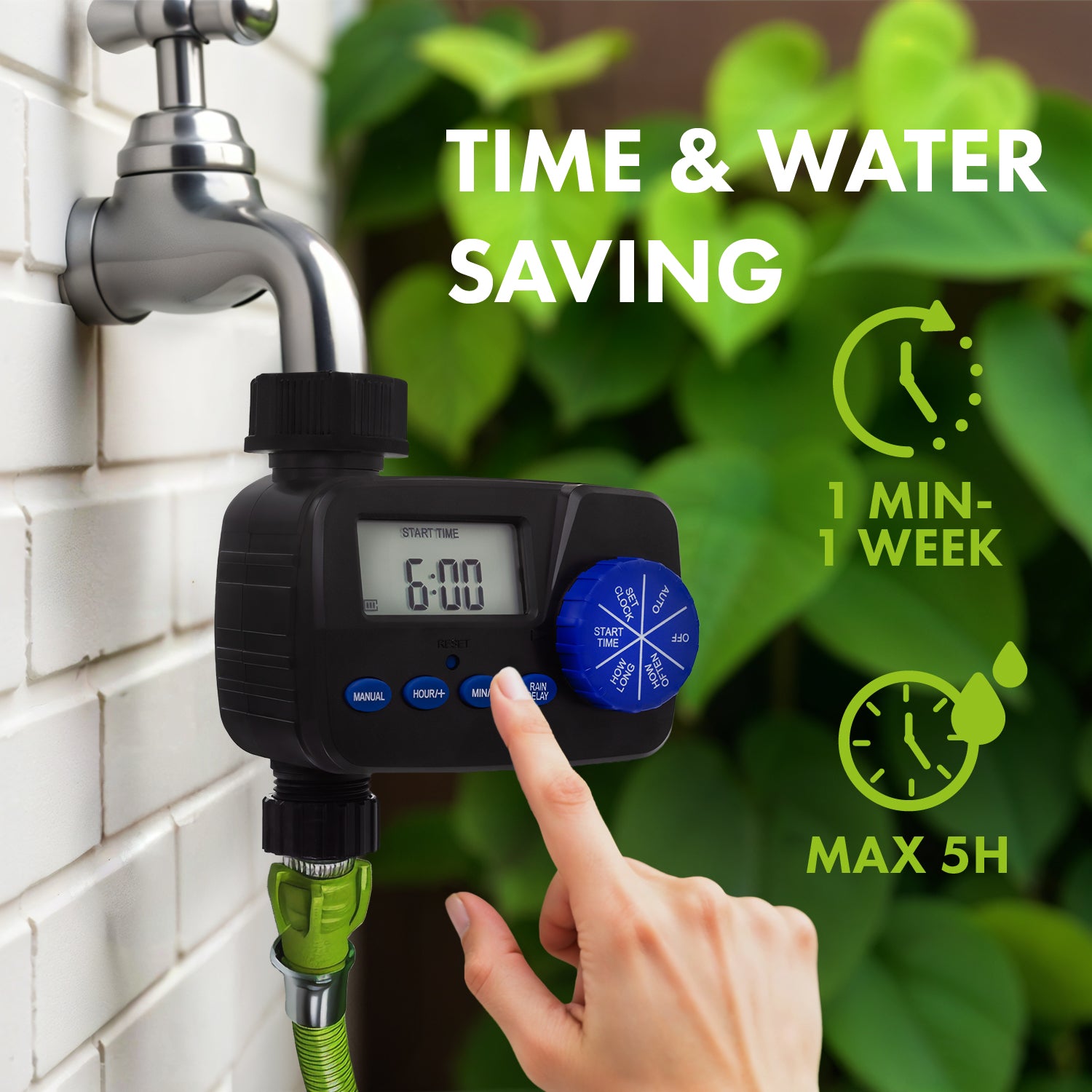 - Reglarea duratei de irigare: 1 - 300 minute