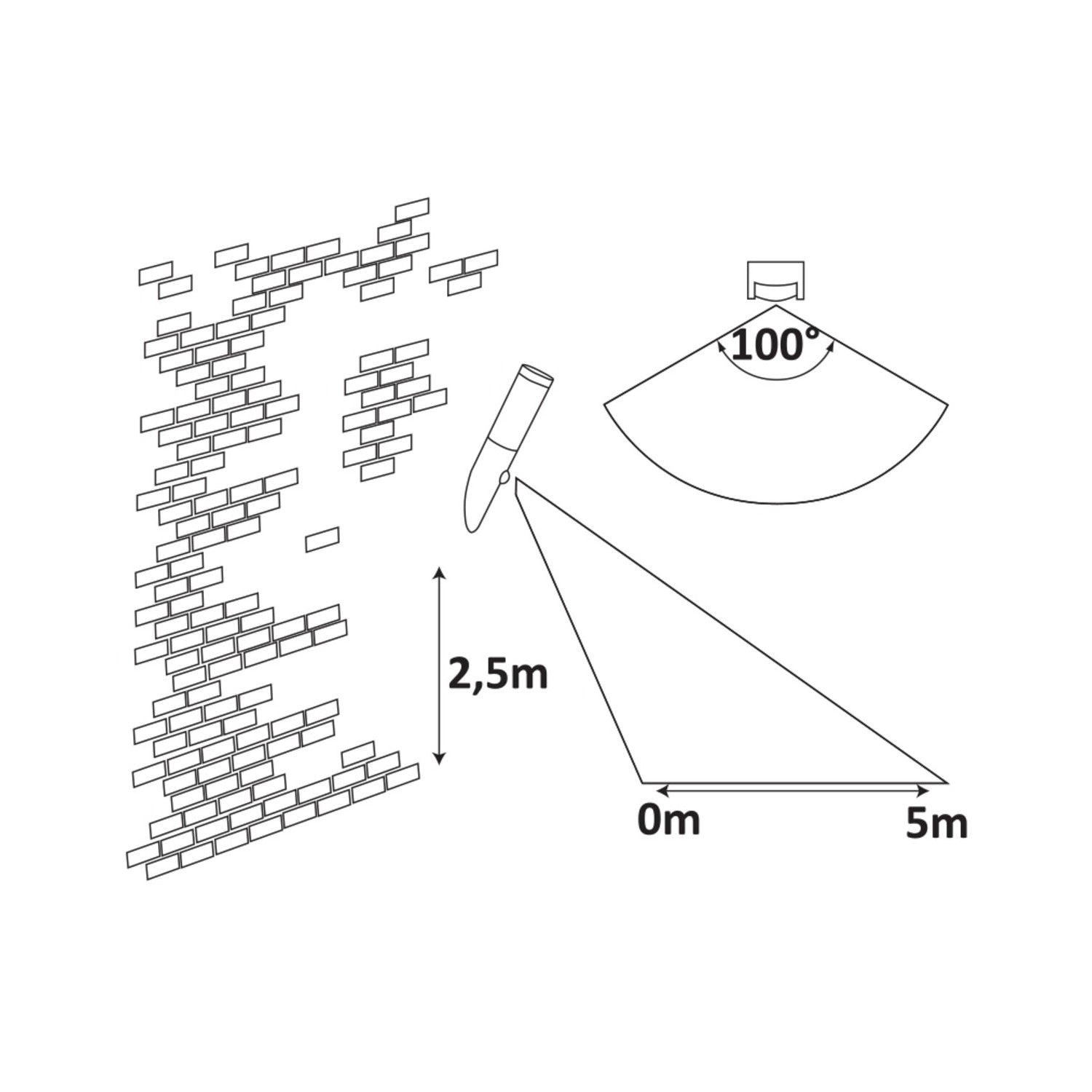 - Senzorul detectează mișcarea de la o distanță de 0-5 metri la un unghi de 100°