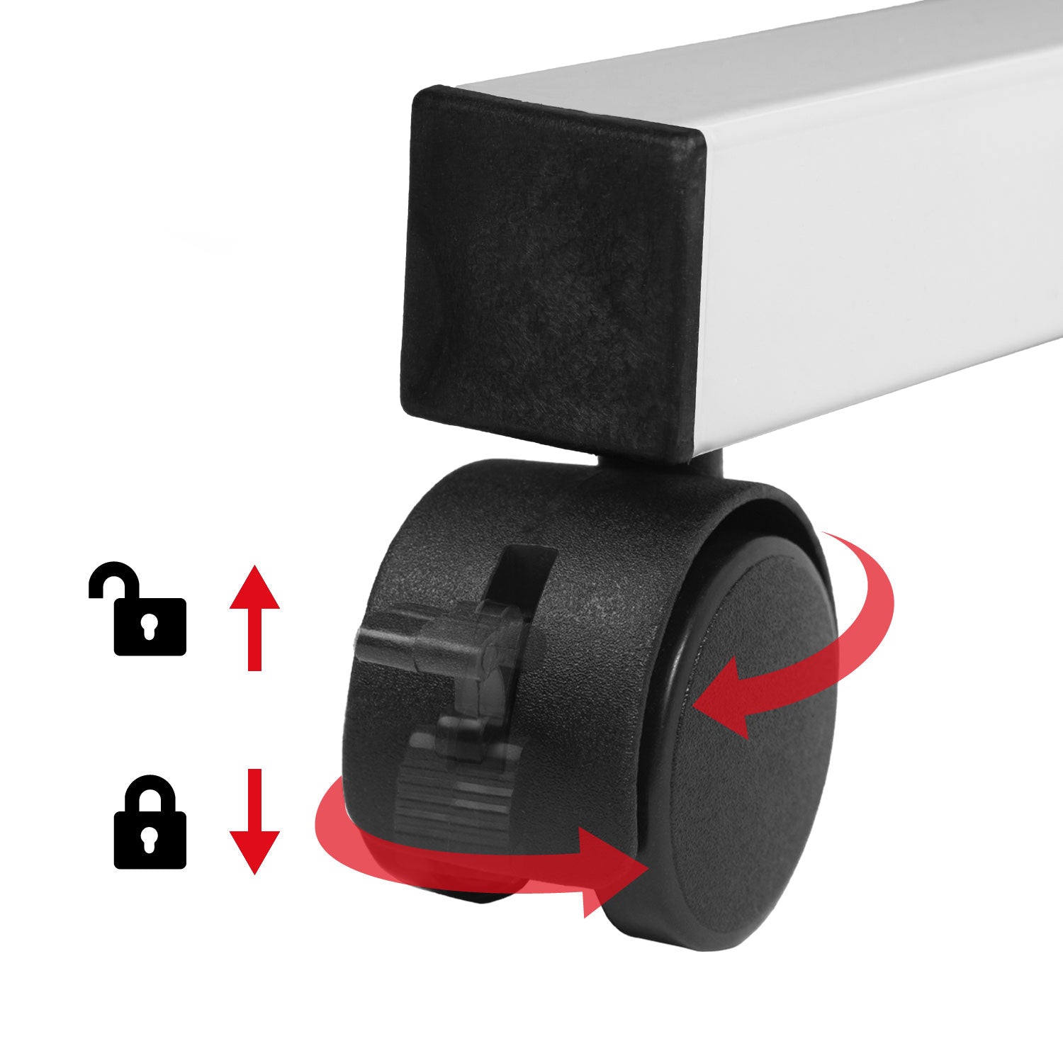 Mobilitatea biroului este asigurată de 6 rotițe blocabile, astfel încât acesta poate fi mutat cu ușurință și apoi fixat în locul dorit. Este o soluție versatilă, funcțională și modernă care va funcționa bine atât acasă, cât și în birou sau studio.