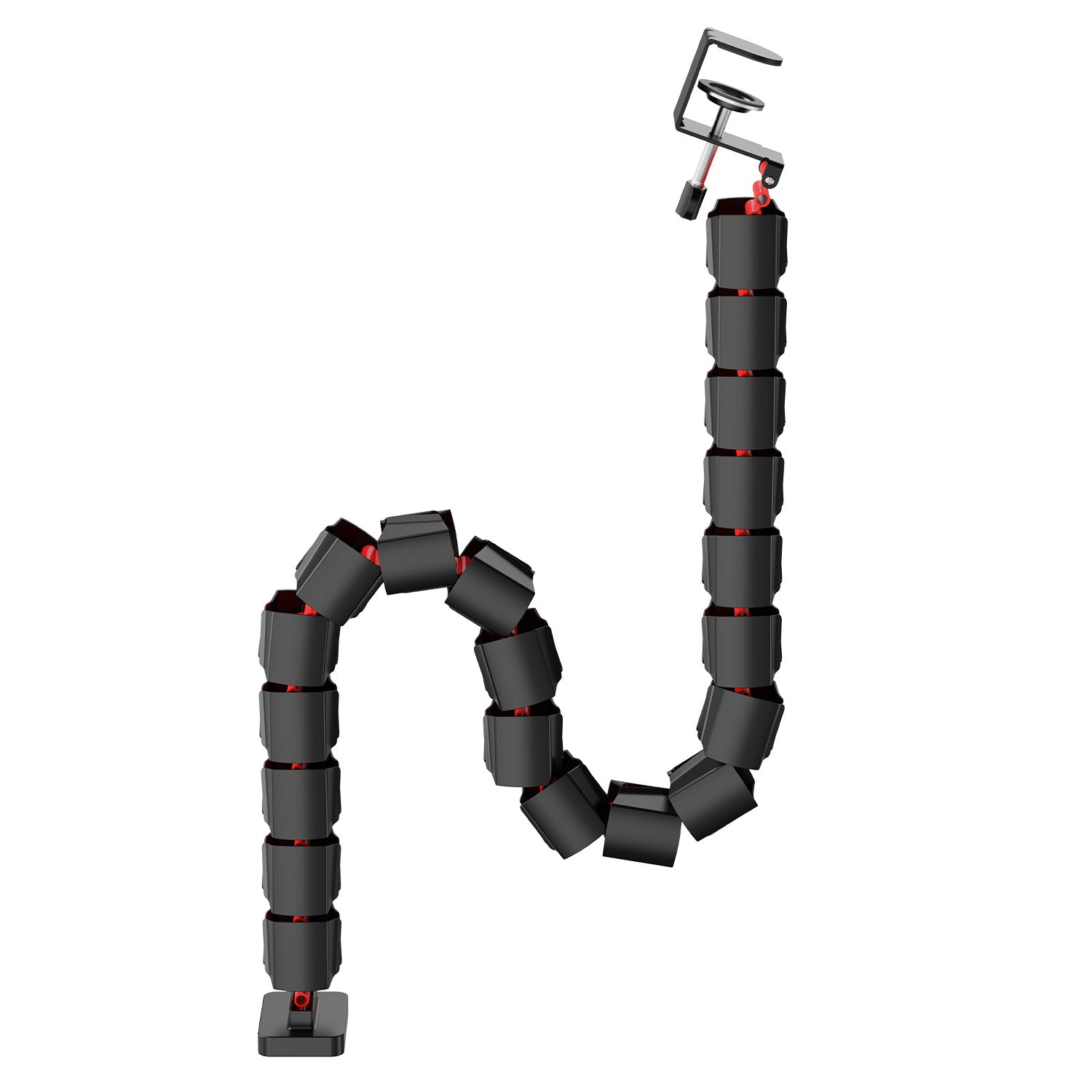 Segmentele negre cu articulații roșii se potrivesc perfect cu stilul jocurilor, subliniind caracterul standului. Cu o lungime de 1345 mm, este ideal chiar și pentru birourile mai mari, iar lungimea poate fi scurtată prin îndepărtarea modulelor individuale, dacă este necesar. Acest organizator nu numai că îmbunătățește aspectul configurației, dar facilitează și gestionarea cablurilor, reducând riscul deteriorării acestora. Este un detaliu mic care face o mare diferență - mai ales dacă vă concentrați pe ordine și stil.