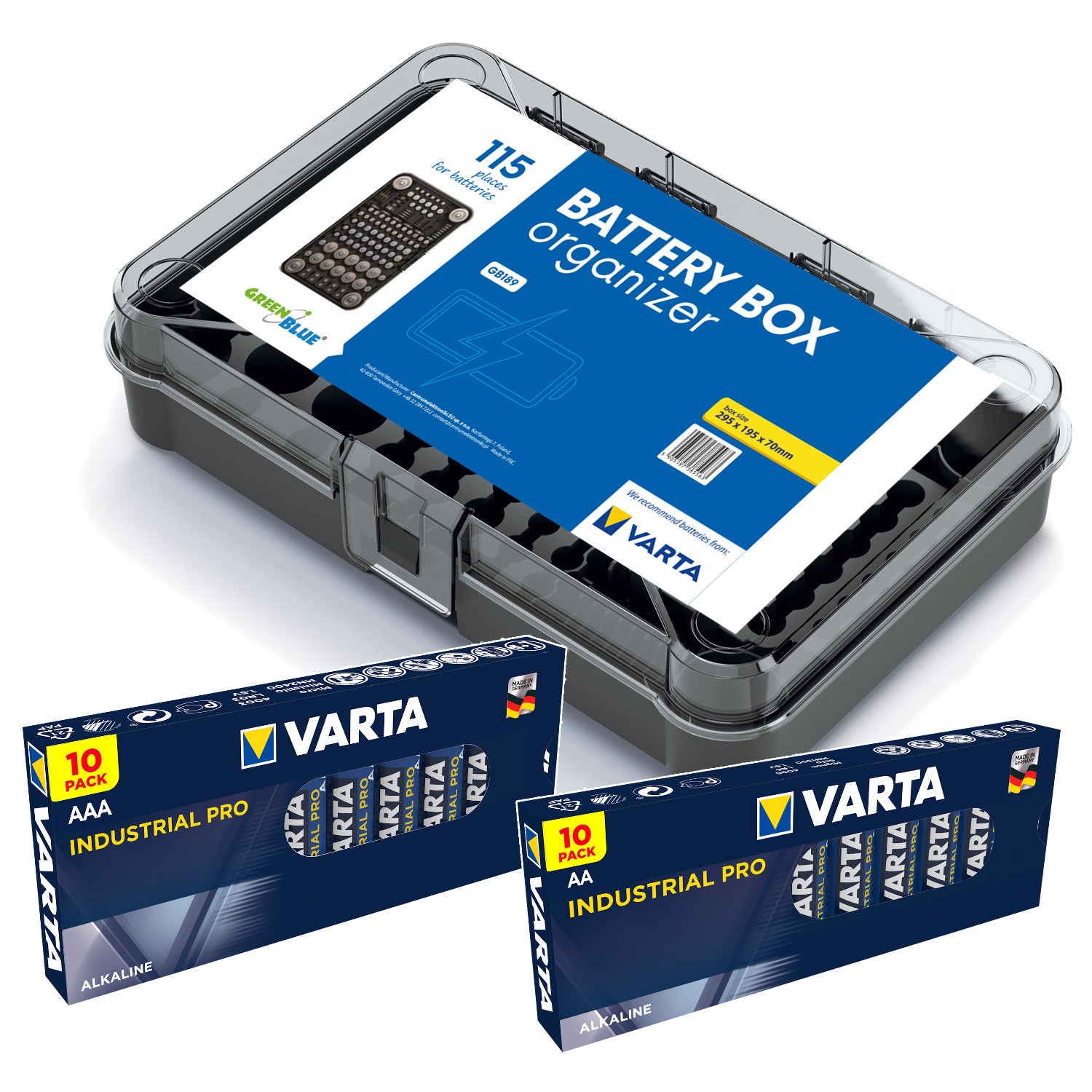 Organizer pentru baterie GreenBlue Varta Box GB189 + 10x baterie AA i 10x baterie AAA Varta Industrial