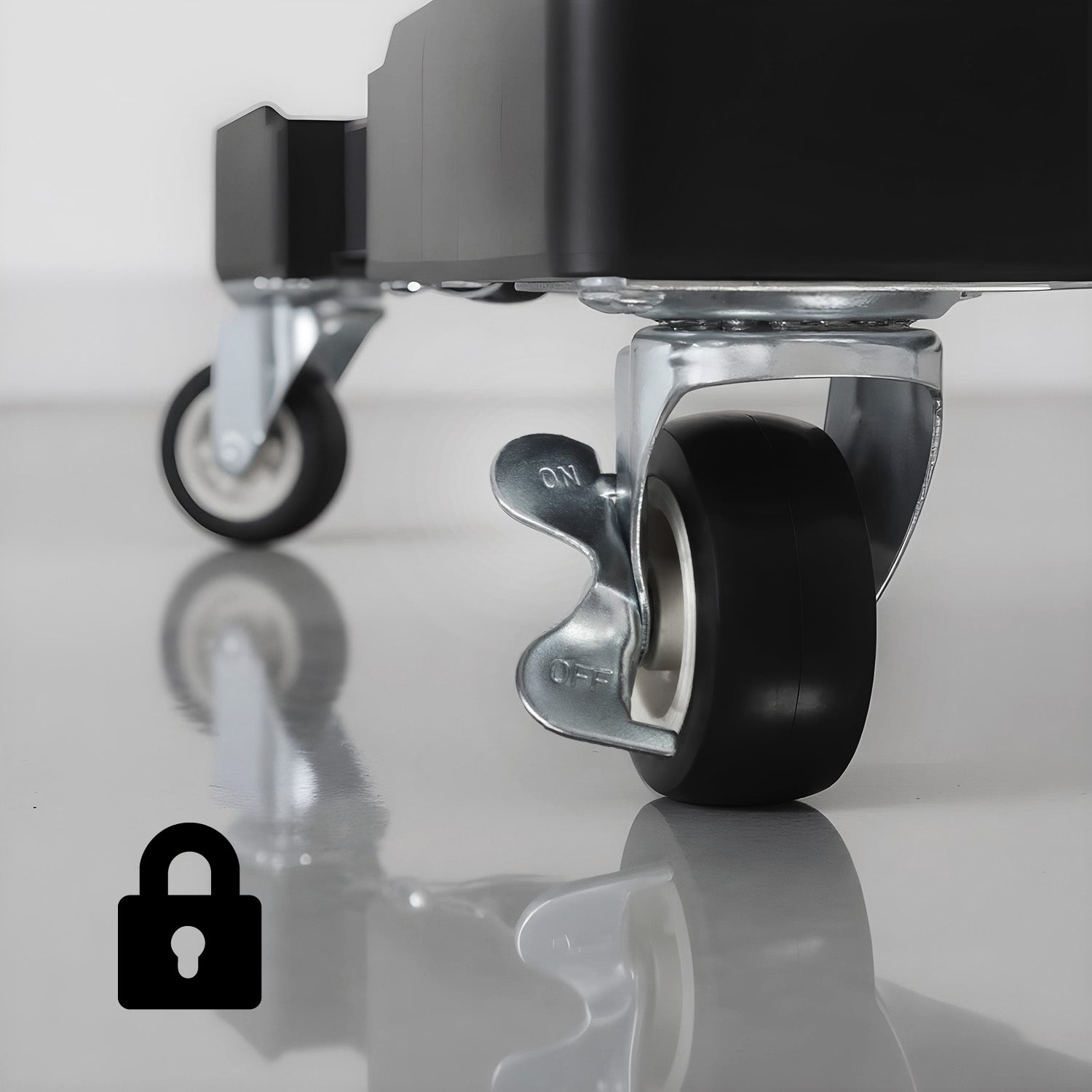 Baza este echipată cu rotițe robuste care permit mutarea cu ușurință a aparatului în orice locație - ideal atunci când curățați sau întrețineți echipamentul. Două dintre rotițe sunt echipate cu un mecanism de blocare, care garantează stabilitatea și împiedică deplasarea accidentală a mașinii de spălat în timpul funcționării. În acest fel, utilizatorul poate fi sigur că aparatul va rămâne pe poziție chiar și atunci când tamburul se rotește intens.