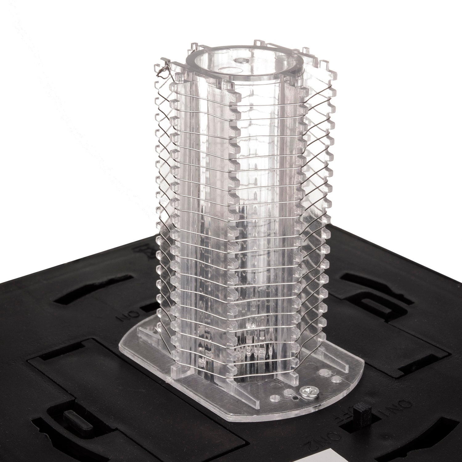 Mod de funcționare: lampa atrage insectele cu o lumină violet LED/UV sigură pentru om, după care reticulul care înconjoară sursa de lumină le rade cu electricitate.