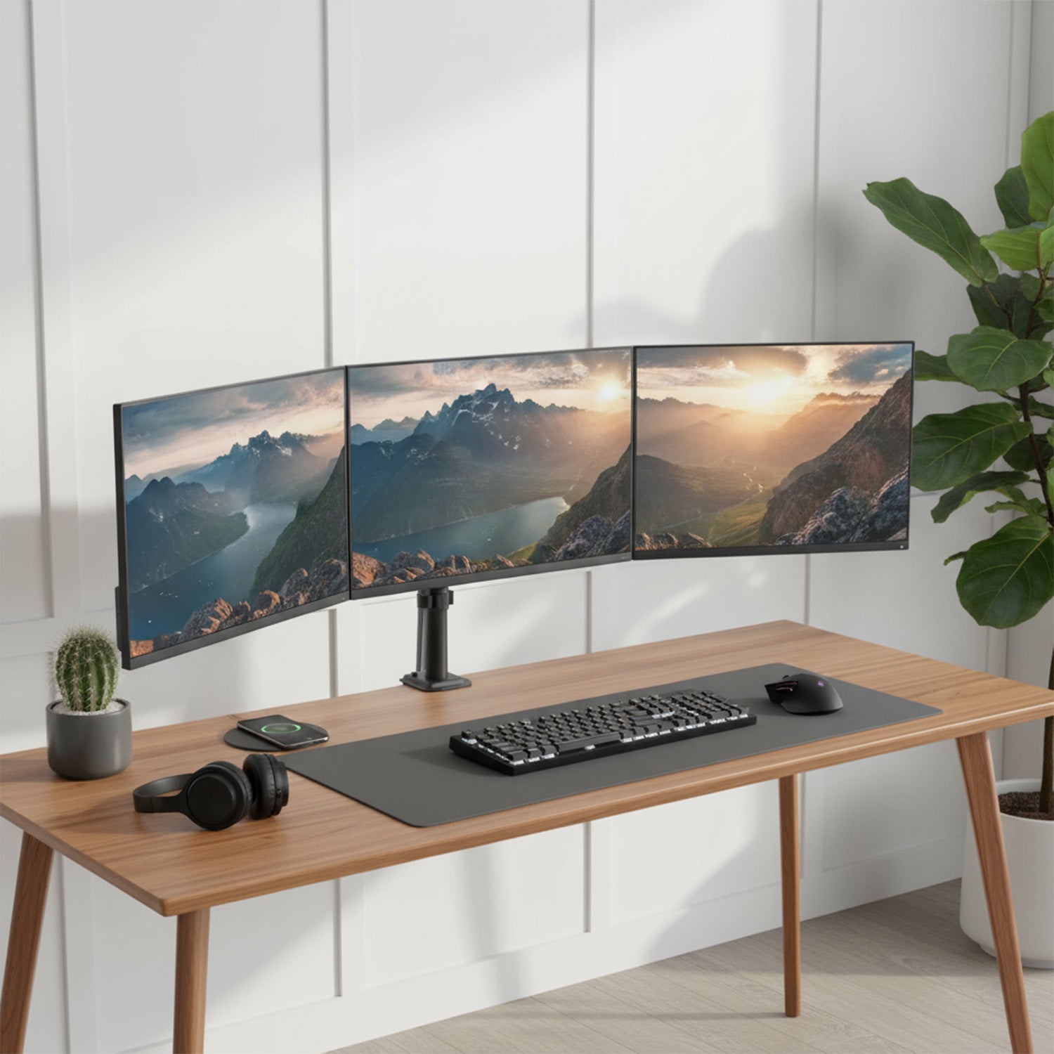 Monitoarele pot fi înclinate de la -45° la +45°, rotite lateral ±90°, iar întregul braț poate pivota la articulații și la stâlp cu ±180°. Această mare flexibilitate vă permite să poziționați ecranele laterale exact așa cum aveți nevoie de ele. Un al treilea monitor, montat central, oferă un punct focal stabil pentru întregul set, creând o dispunere perfect echilibrată.