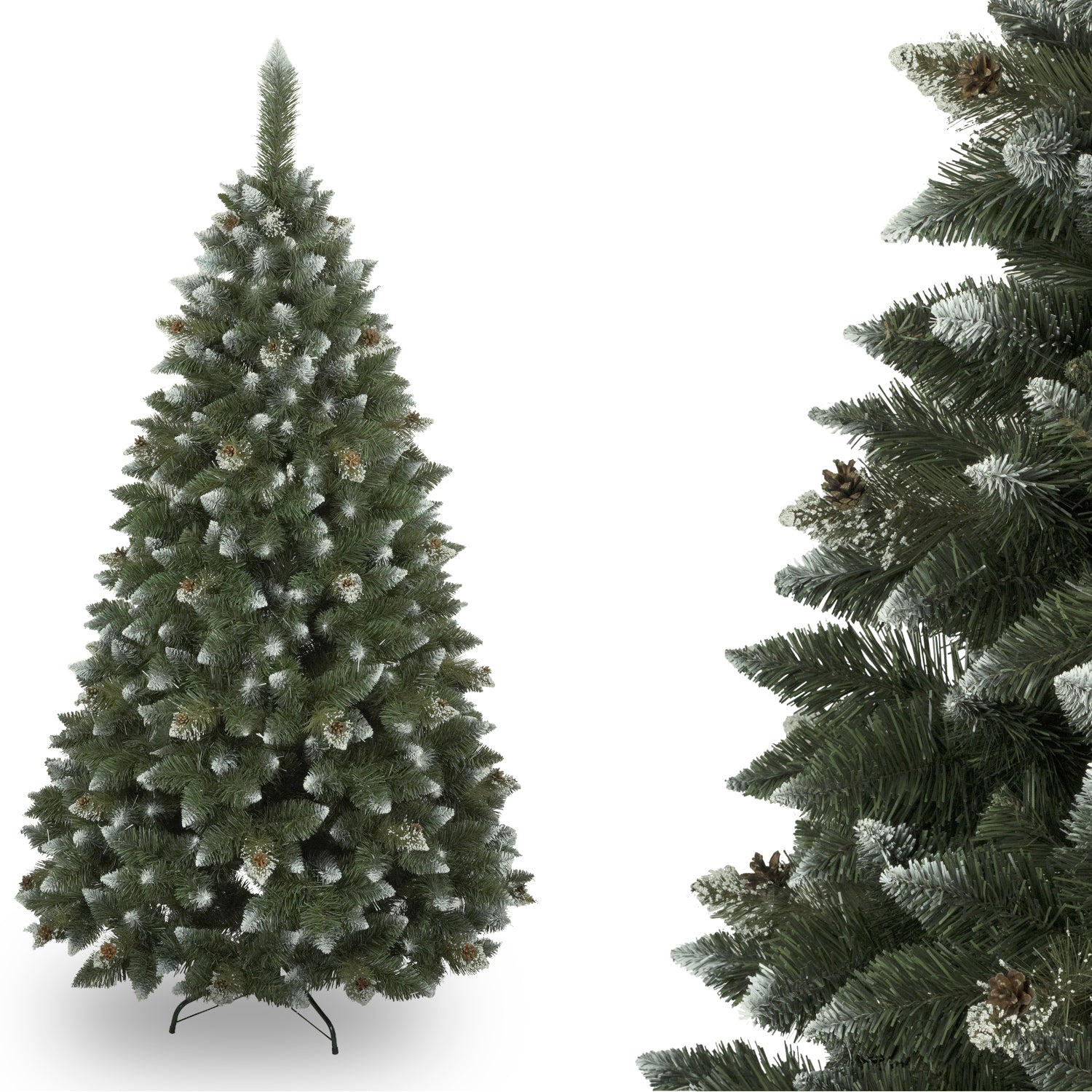Bradul artificial Diamond Pine, din PVC, de culoare verde naturală și ramurile maro ale copacului este perfect pentru decorarea locuintei in preajma sarbatorilor. Acele pinului au o lungime de aproximativ 4 cm, ceea ce face ca arborele să fie foarte stufos și dens. Ramurile bradului sunt fixate pe sârmă dublă de oțel astfel încât chiar și ornamentele grele pot fi atârnate in pom. Pinul este decorat cu fulgi de diamante albe care imită zăpada reală, iar unele ramuri sunt acoperite cu vopsea albă care nu se desprinde. Pentru a da un aspect natural, am adăugat conuri de pin naturale care sunt atașate permanent de copac.