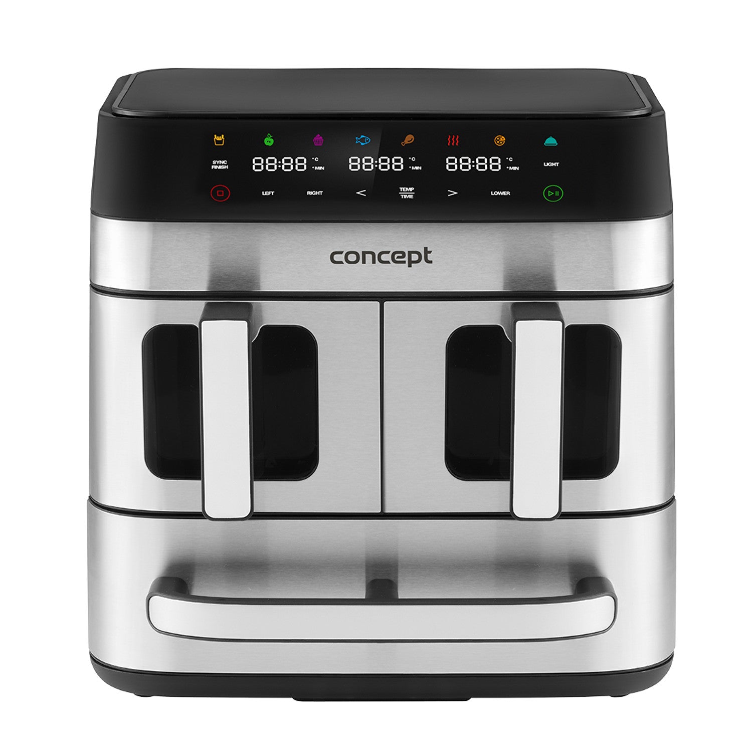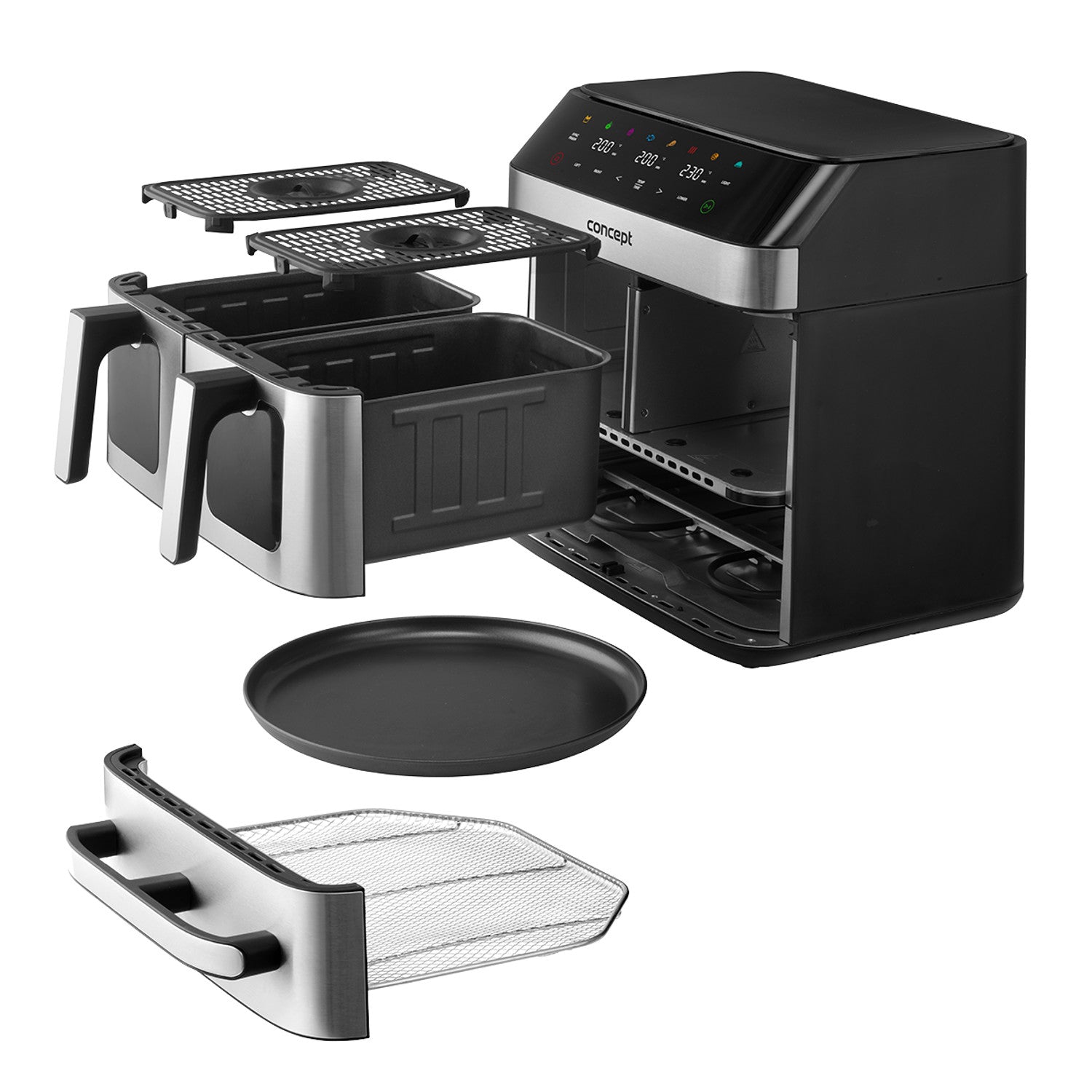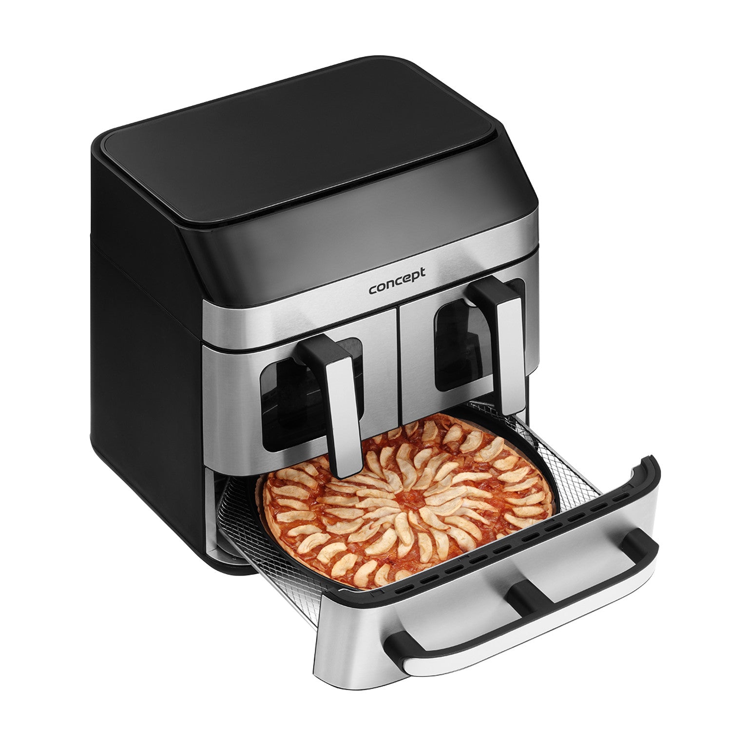 Cu friteuza fără grăsimi PIZZA TRIO Concept FR9000 de 18,5 l, cu două coșuri independente și un sertar multifuncțional pentru copt, veți pregăti un meniu complet deodată. În timp ce pregătiți un fel principal și o garnitură în coșurile friteuzei, coaceți o prăjitură pentru cafeaua de după-amiază în sertarul multifuncțional. Aceasta este noua generație de gătit - rapid, gustos, eficient și fără compromisuri.
