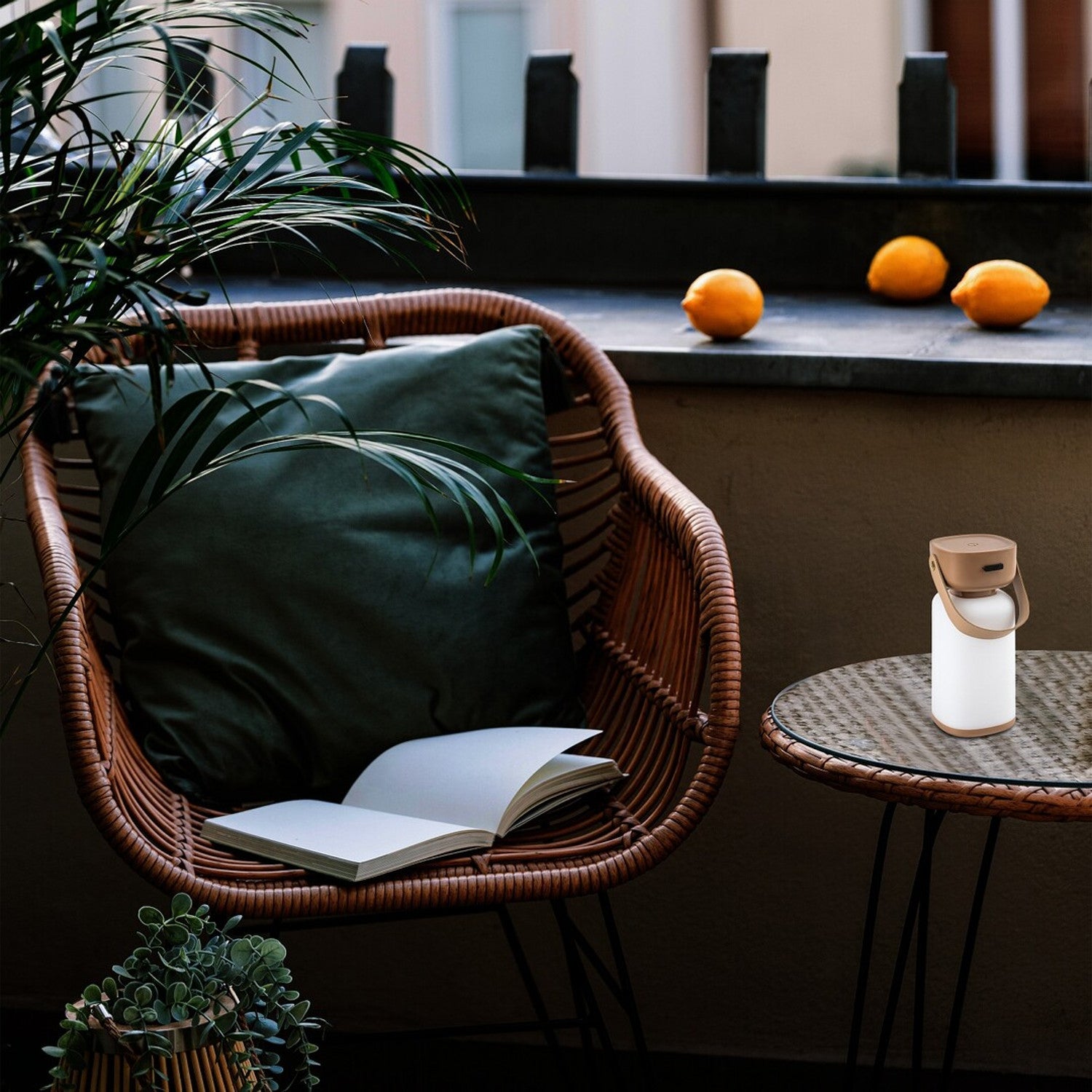Cu designul său asemănător unui felinar, lampa are un grad de protecție IP44, ceea ce o face sigură pentru utilizarea pe terasă sau în grădină. Are o sursă de lumină LED încorporată, a cărei luminozitate și temperatură de culoare pot fi reglate prin intermediul unui comutator sensibil la atingere. Este echipata cu o baterie reîncărcabilă încorporată care poate fi încărcată în 3 ore cu ajutorul unui cablu USB-C și durează 10 ore când este complet încărcată. Datorită tehnologiei LED, acest model are o durată lungă de viață.