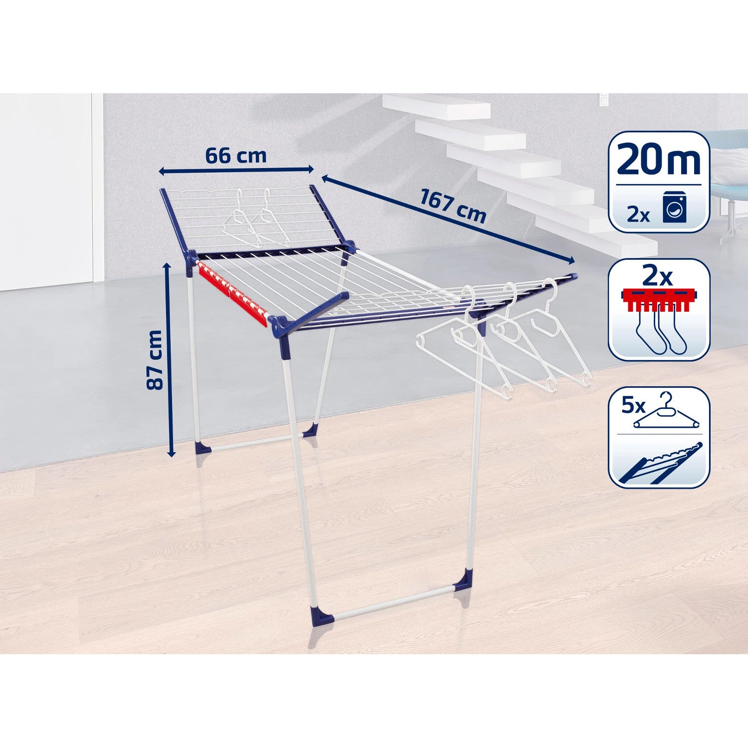 Leifheit Pegasus 200 Suport de uscare solid, lungime linie 20 m, picioare paralele stabile, rezistent la intemperii, 2 cleme pentru rufe, 81520