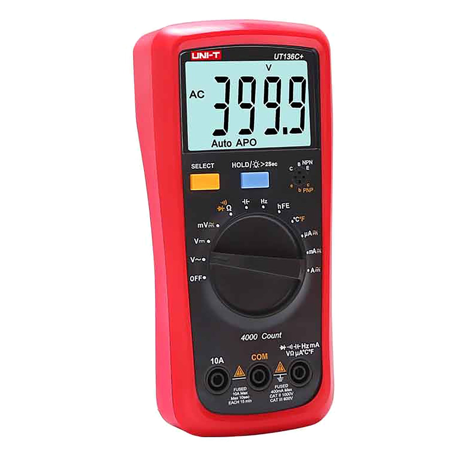 UT136C+ permite măsurarea tensiunilor de curent continuu (DC) și curent alternativ (AC) de până la 1000 V, permițându-i să lucreze cu diferite tipuri de instalații electrice. De asemenea, dispozitivul oferă măsurarea curentului până la 10 A și a rezistenței până la 40 MOhm, ceea ce îl face un instrument de diagnosticare versatil. În plus, contorul poate măsura temperatura pe o gamă largă de la -40°C la 1000°C și de la -40°F la 1832°F, adăugându-se funcționalității sale. Funcțiile de testare a diodelor, de verificare a continuității circuitului și de măsurare hFE a tranzistorului completează setul bogat de capabilități.