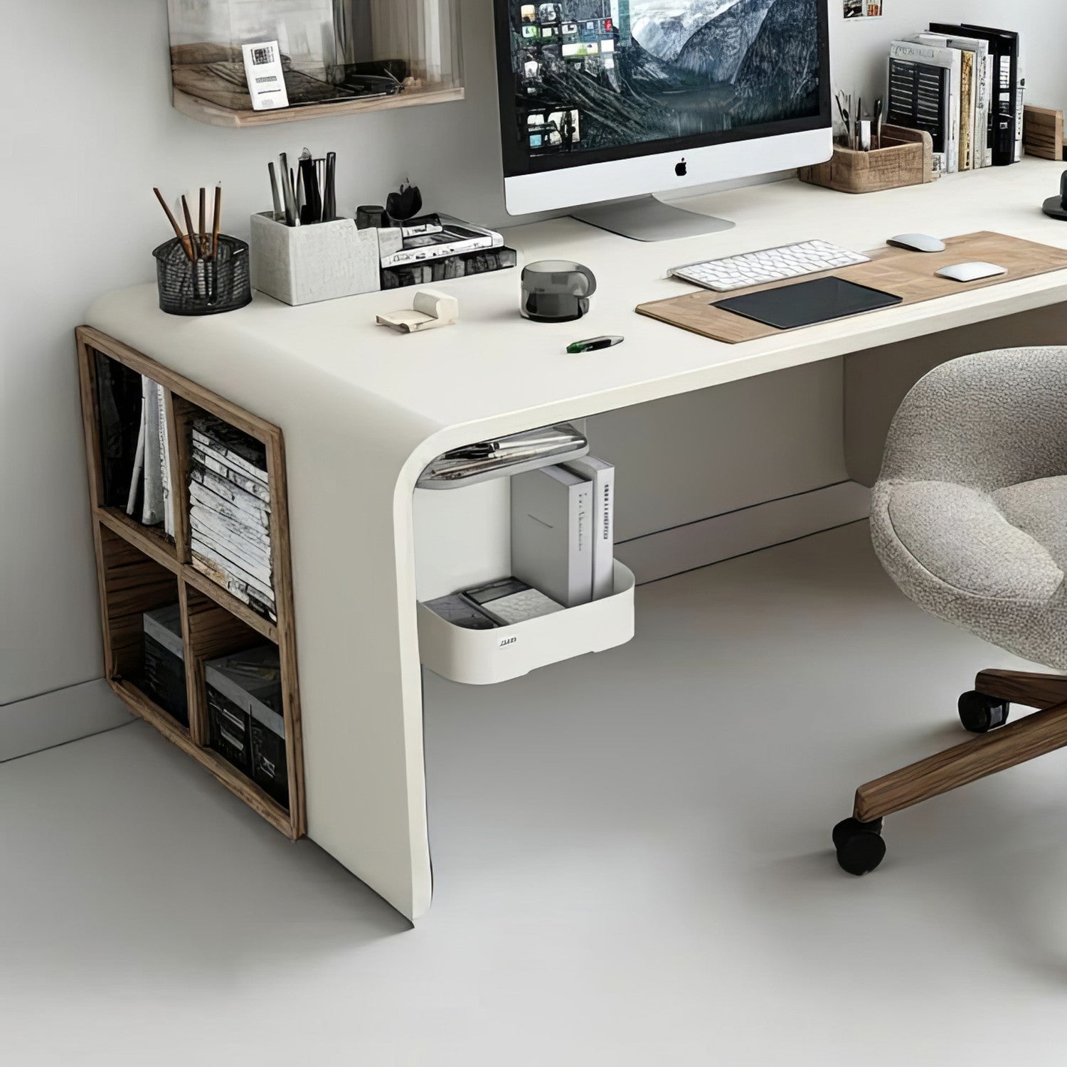 Organizator de birou de inalta calitate, compact si spatios, care se monteaza sub birou. Suprafata raftului inferior este acoperita cu pasla. Datorita designului sau modern, organizatorul se potriveste perfect in orice mediu.